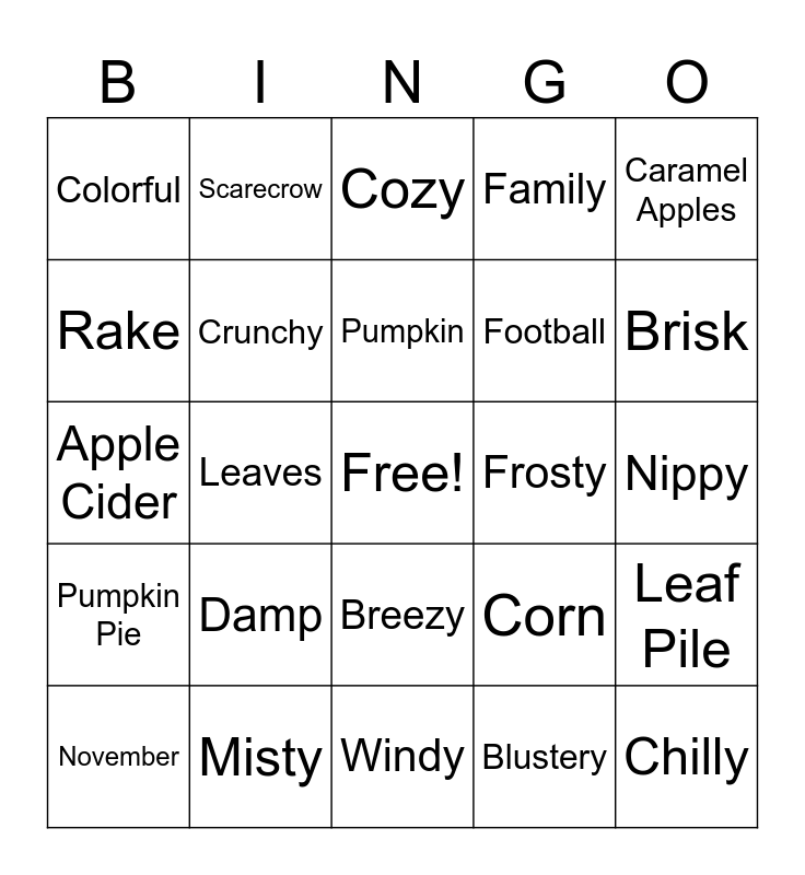 This bingo card has a free space and 29 words: November, Autumn, Leaves, Vibrant, Colorful, Cozy, Crunchy, Damp, Frosty, Misty, Nippy, Chilly, Windy, Blustery, Brisk, Drizzle, Breezy, Pumpkin Pie, Caramel Apples, Apple Cider, Corn, Turkey, Football, Rake, Family, Scarecrow, Leaf Pile, Pumpkin and Dinner.
