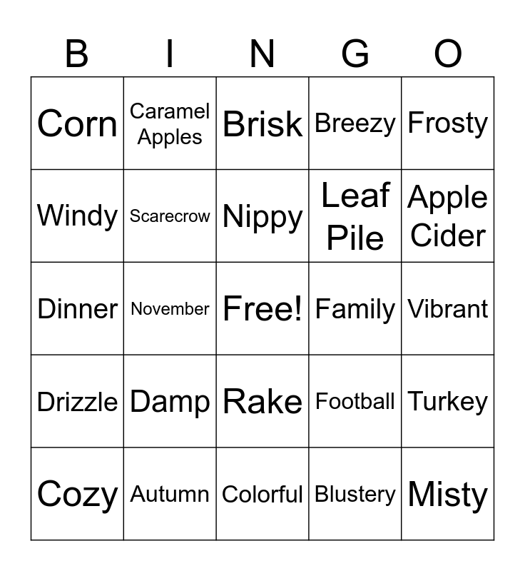 This bingo card has a free space and 29 words: Cozy, Pumpkin Pie, November, Leave, Corn, Brisk, Scarecrow, Damp, Family, Autumn, Vibrant, Misty, Colorful, Blustery, Apple Cider, Chilly, Rake, Drizzle, Frosty, Dinner, Football, Pumpkin, Leaf Pile, Windy, Breezy, Caramel Apples, Turkey, Nippy and Crunchy.