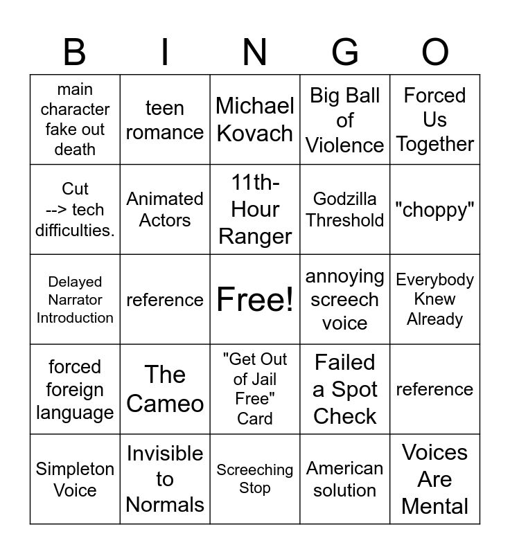 This bingo card has a free space and 79 words: bad voice acting, All Animation Is Disney, Michael Kovach, comic/book addiptation., poorly timed add, musical number is bad., musical number is good!, montage, someone dies as a joke, main character dies accually, Clothespin Nose Plug, ash face, Big Ball of Violence, main character fake out death, Fourth wall Break, Cut --> tech difficulties., Motion Capture, The Cameo, Rotoscoping, Everybody Knew Already, deus ex machina, Forced Us Together, Delayed Narrator Introduction, 11th-Hour Ranger, Animated Actors, Elongating Arm Gag, Everything Dances, line thickness odd, Shrunk in the Wash, eyebrows over eyes/hair, "choppy", Scooby Stack, Screeching Stop, Shades of Suffocation, Simpleton Voice, annoying screech voice, teeth whistle voice, Echoes, Tertiary Sexual Characteristics, Voices Are Mental, Synchro-Vox, The Twelve Principles of Animation get violated, flanderisation, deflanderisation, fight scene, teen romance, Tom Kenny, indie icon, Evil Phone or tech, character meant exactly what they said and weren't using a figure of speech, reference, reference, Failed a Spot Check, Failure Is the Only Option, Fake Static, Foreshadowing, Fake Defector, A Fool for a Client, "Freaky Friday" Flip, "Get Out of Jail Free" Card, Godzilla Threshold, Here We Go Again!, High-Voltage Death, How Much Did You Hear?, cold open, Human Shield, I Have Your, I Just Want to Be Normal, Identical Grandson, forced foreign language, Invisible to Normals, Leaning on the Fourth Wall, Major Injury Underreaction, Make a Wish, Mundane Solution, American solution, Ruth Goldberg, Not Helping Your Case and Not in Front of the Parrot!.