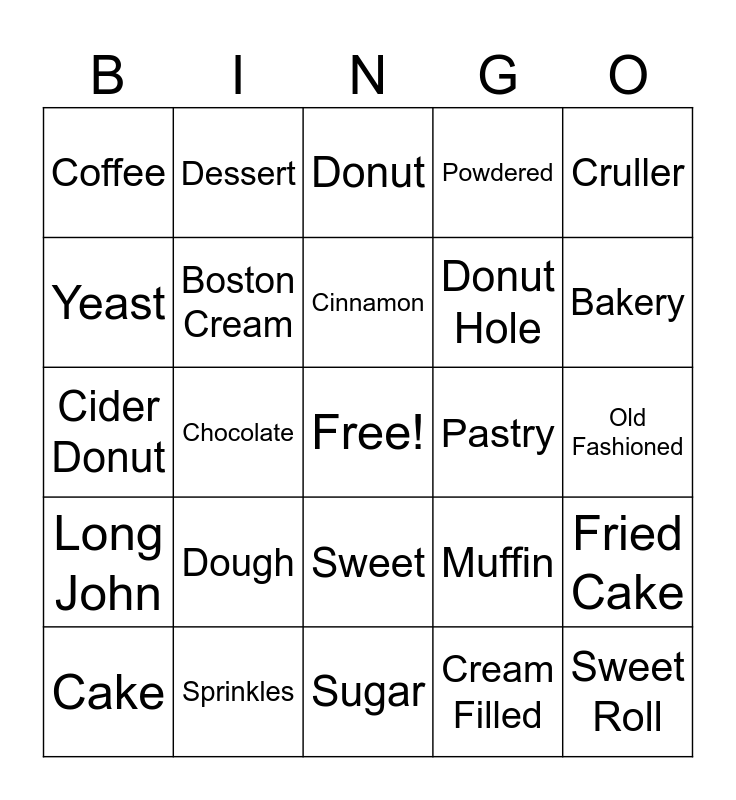 This bingo card has a free space and 29 words: Cake, Fried, Chocolate, Danish, Coffee, Donut, Boston Cream, Dough, Pastry, Sprinkles, Old Fashioned, Sweet Roll, Sugar, Cream Filled, Bakery, Glazed, Sweet, Long John, Cruller, Cider Donut, Muffin, Frosting, Donut Hole, Yeast, Powdered, Dessert, Fried Cake, Cinnamon and Jelly Filled.