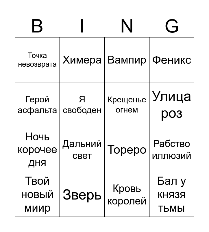 This bingo card has 25 words: Free!, Беспечный ангел, Улица роз, Встань, страх преодолей, Герой асфальта, Точка невозврата, Я свободен, Химера, Зверь, Искушение, Ночь корочее дня, Тореро, Бесы, Игра с огнем, Крещенье огнем, Замкнутый круг, Кровь королей, Вампир, Дальний свет, Рабство иллюзий, Твой новый миир, Пытка тишиной, Бал у князя тьмы, Феникс and Симфония огня.
