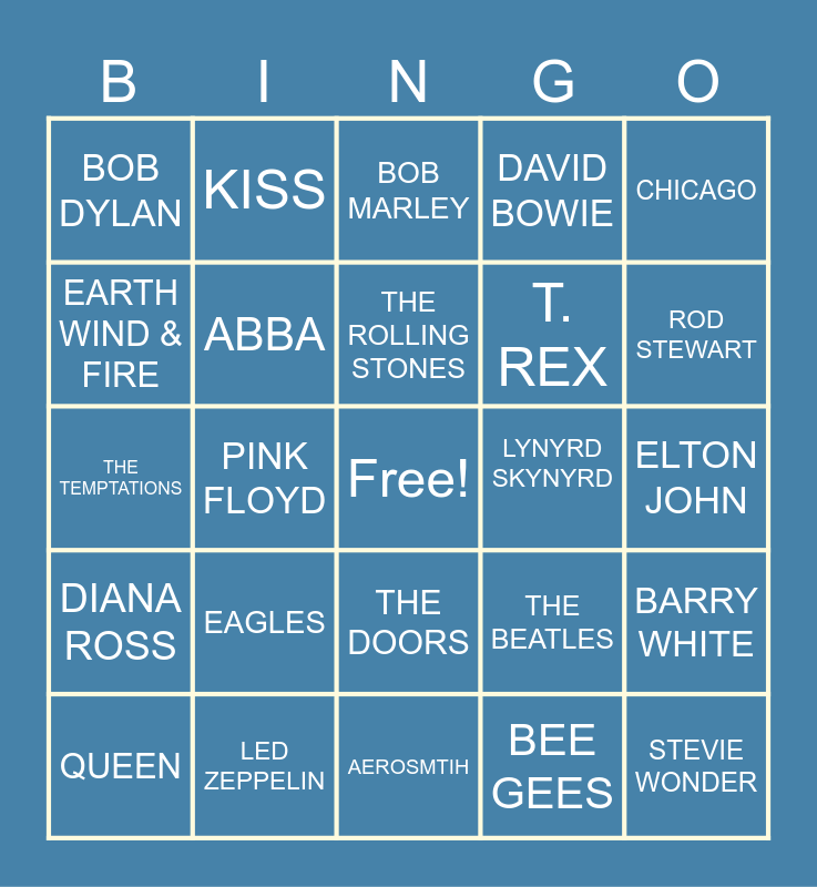 This bingo card has a free space and 24 words: EAGLES, LED ZEPPELIN, THE ROLLING STONES, QUEEN, CHICAGO, BOB DYLAN, EARTH WIND & FIRE, KISS, LYNYRD SKYNYRD, THE DOORS, T. REX, THE TEMPTATIONS, THE BEATLES, BARRY WHITE, ABBA, BEE GEES, ELTON JOHN, BOB MARLEY, ROD STEWART, PINK FLOYD, STEVIE WONDER, DIANA ROSS, DAVID BOWIE and AEROSMTIH.