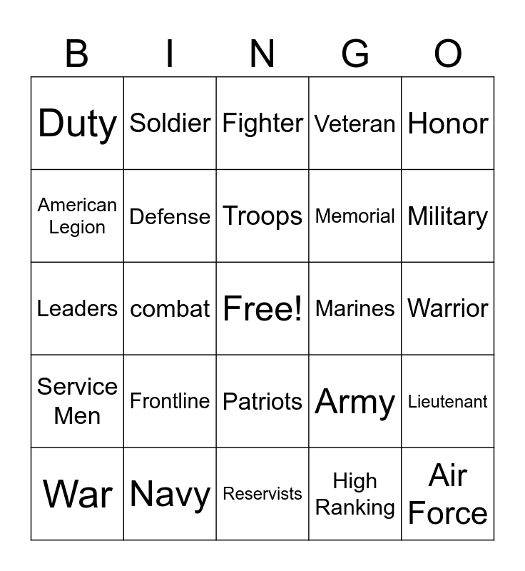 This bingo card has a free space and 29 words: War, U.S.A, combat, Active Duty, Duty, Fighter, Defense, Frontline, Marines, Navy, Warrior, Air Force, Reservists, High Ranking, Military, Heroes, Patriots, Service Men, Honor, Leaders, Army, Artillery, Memorial, American Legion, Veteran, Soldier, Lieutenant, Troops and Active.