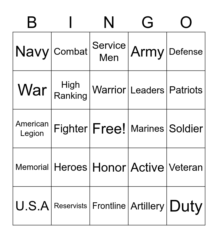 This bingo card has a free space and 29 words: U.S.A, Military, Fighter, Troops, Navy, Service Men, High Ranking, Heroes, Marines, Reservists, Soldier, Duty, Frontline, Artillery, Patriots, Active Duty, Honor, Memorial, Defense, American Legion, Active, Lieutenant, Leaders, War, Army, Combat, Veteran, Warrior and Air Force.