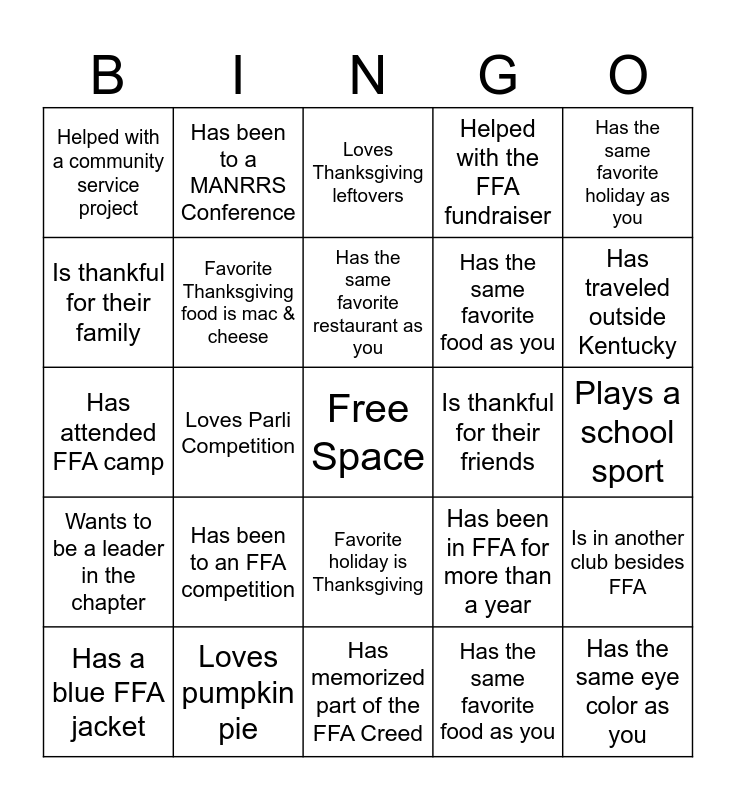 This bingo card has a free space and 24 words: Has a blue FFA jacket, Has been to an FFA competition, Has the same favorite restaurant as you, Has the same favorite food as you, Has the same favorite holiday as you, Helped with a community service project, Has been to a MANRRS Conference, Loves Thanksgiving leftovers, Is thankful for their friends, Plays a school sport, Has attended FFA camp, Favorite Thanksgiving food is mac & cheese, Has been in FFA for more than a year, Is in another club besides FFA, Is thankful for their family, Loves pumpkin pie, Has memorized part of the FFA Creed, Helped with the FFA fundraiser, Has traveled outside Kentucky, Wants to be a leader in the chapter, Loves Parli Competition, Favorite holiday is Thanksgiving, Has the same favorite food as you and Has the same eye color as you.
