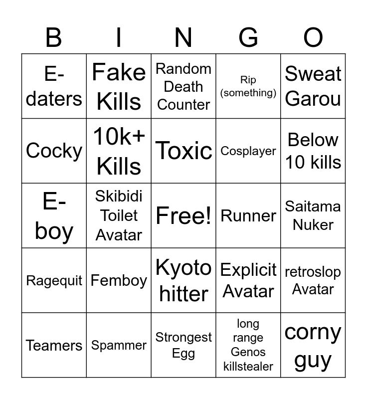 This bingo card has a free space and 24 words: Femboy, Spammer, Toxic, Teamers, Sweat Garou, E-daters, Cocky, Fake Kills, Runner, Kyoto hitter, Cosplayer, E-boy, Explicit Avatar, retroslop Avatar, 10k+ Kills, long range Genos killstealer, Saitama Nuker, Random Death Counter, Below 10 kills, Skibidi Toilet Avatar, corny guy, Ragequit, Rip (something) and Strongest Egg.