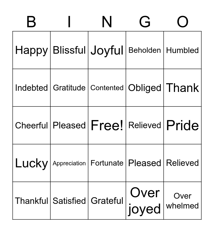 This bingo card has a free space and 29 words: Thankful, Glad, Pleased, Delighted, Happy, Joyful, Gratitude, Appreciation, Relieved, Satisfied, Pride, Over whelmed, Grateful, Over joyed, Thank, Joyous, Fortunate, Lucky, Humbled, Cheerful, Pleased, Blessed, Obliged, Indebted, Beholden, Blissful, Relieved, Contented and Tickled.