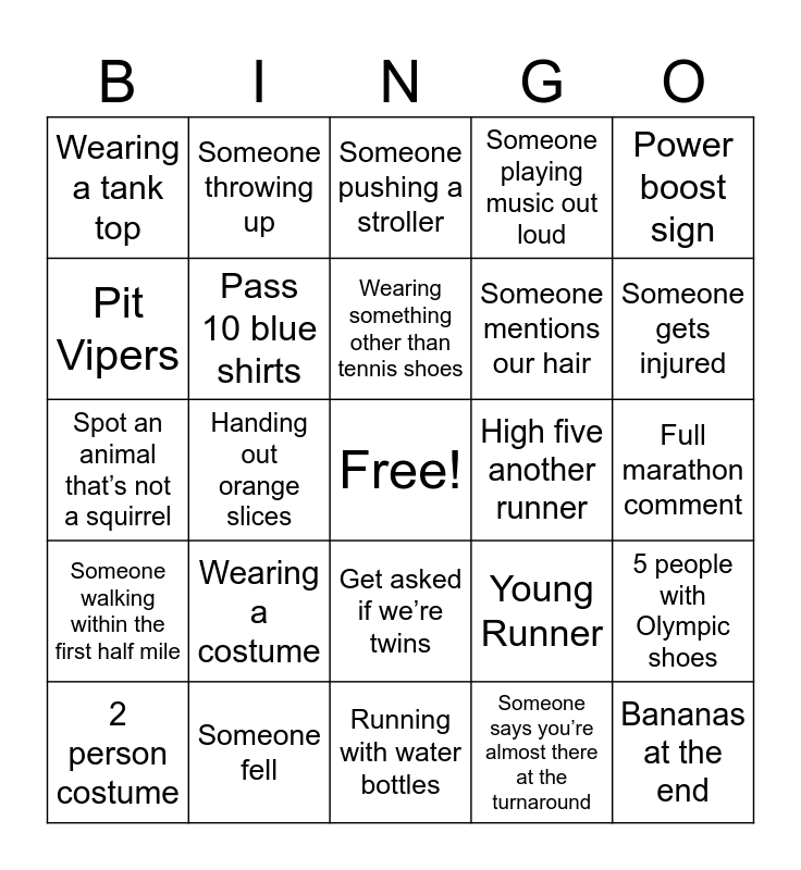 This bingo card has a free space and 24 words: Wearing a costume, Someone fell, Wearing something other than tennis shoes, 2 person costume, Power boost sign, Wearing a tank top, Pit Vipers, Someone throwing up, High five another runner, Get asked if we’re twins, Someone mentions our hair, Spot an animal that’s not a squirrel, Young Runner, 5 people with Olympic shoes, Pass 10 blue shirts, Someone says you’re almost there at the turnaround, Full marathon comment, Someone pushing a stroller, Someone gets injured, Handing out orange slices, Bananas at the end, Someone walking within the first half mile, Someone playing music out loud and Running with water bottles.