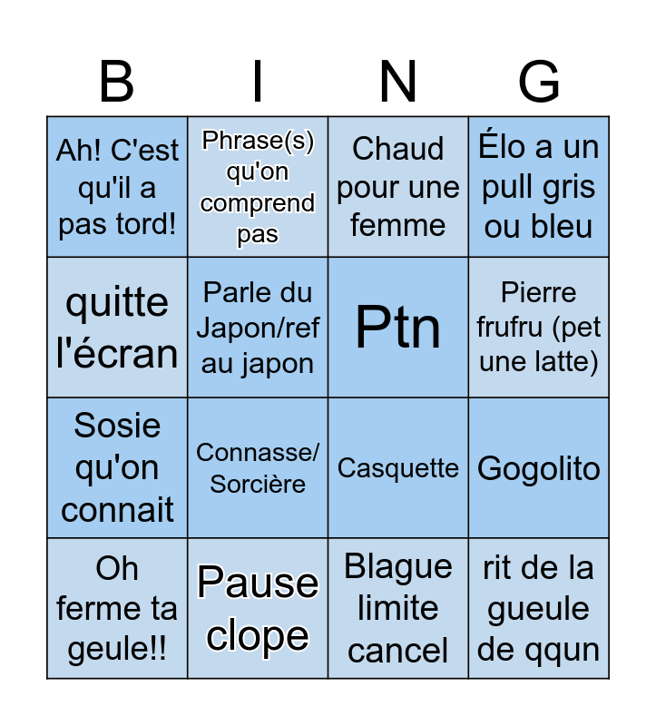 This bingo card has 16 words: Pause clope, Gogolito, Chaud pour une femme, Ah! C'est qu'il a pas tord!, Sosie qu'on connait, Phrase(s) qu'on comprend pas, Casquette, Blague limite cancel, quitte l'écran, Parle du Japon/ref au japon, Oh ferme ta geule!!, Élo a un pull gris ou bleu, Connasse/ Sorcière, Pierre frufru (pet une latte), Ptn and rit de la gueule de qqun.