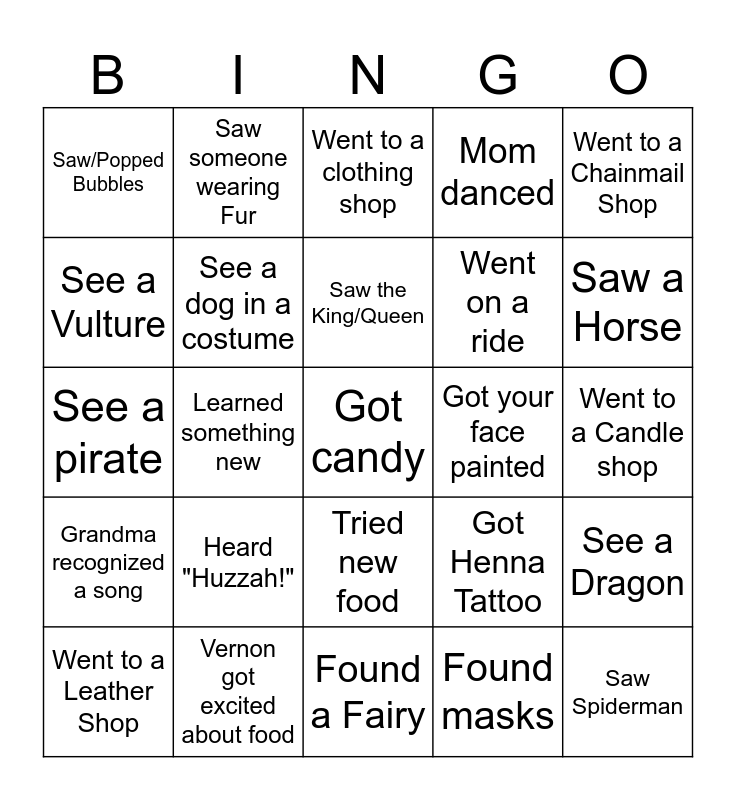 This bingo card has 25 words: Heard "Huzzah!", Found a Fairy, Saw the King/Queen, Went to a Leather Shop, Went to a Chainmail Shop, Saw/Popped Bubbles, See a Vulture, Saw someone wearing Fur, Got your face painted, Tried new food, Went on a ride, See a pirate, Got Henna Tattoo, See a Dragon, See a dog in a costume, Saw Spiderman, Went to a Candle shop, Went to a clothing shop, Saw a Horse, Learned something new, Got candy, Vernon got excited about food, Grandma recognized a song, Mom danced and Found masks.