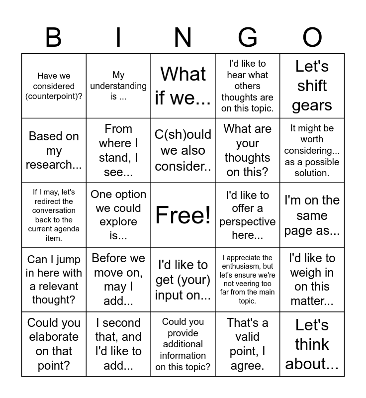This bingo card has a free space and 24 words: Before we move on, may I add..., I second that, and I'd like to add..., C(sh)ould we also consider.., Could you elaborate on that point?, Let's shift gears, Have we considered (counterpoint)?, Based on my research..., My understanding is ..., I'd like to offer a perspective here..., I'd like to get (your) input on..., What are your thoughts on this?, If I may, let's redirect the conversation back to the current agenda item., I appreciate the enthusiasm, but let's ensure we're not veering too far from the main topic., I'd like to weigh in on this matter..., From where I stand, I see..., That's a valid point, I agree., I'm on the same page as..., What if we..., It might be worth considering... as a possible solution., One option we could explore is..., Let's think about..., Can I jump in here with a relevant thought?, I'd like to hear what others thoughts are on this topic. and Could you provide additional information on this topic?.