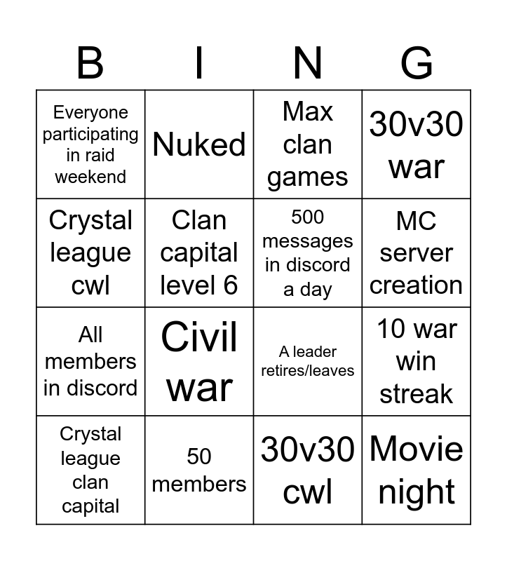 This bingo card has 16 words: 50 members, 10 war win streak, Max clan games, Everyone participating in raid weekend, All members in discord, Nuked, A leader retires/leaves, 30v30 cwl, Crystal league cwl, Clan capital level 6, Crystal league clan capital, 30v30 war, Civil war, MC server creation, 500 messages in discord a day and Movie night.