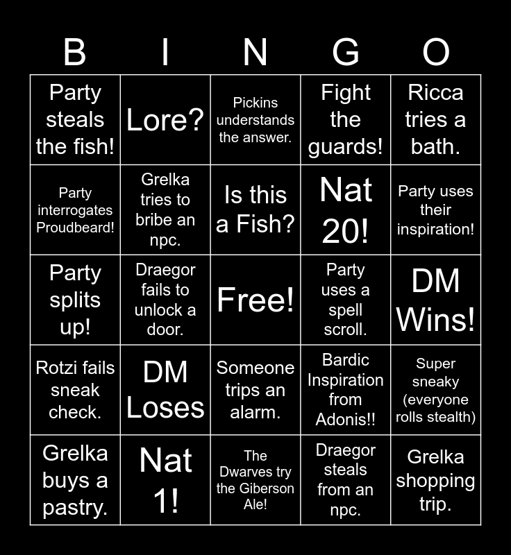 This bingo card has a free space and 24 words: DM Loses, Nat 1!, Is this a Fish?, Grelka buys a pastry., Ricca tries a bath., Party steals the fish!, Party interrogates Proudbeard!, Lore?, Party uses a spell scroll., Someone trips an alarm., Nat 20!, Party splits up!, Bardic Inspiration from Adonis!!, Super sneaky (everyone rolls stealth), Grelka tries to bribe an npc., Draegor steals from an npc., DM Wins!, Pickins understands the answer., Party uses their inspiration!, Draegor fails to unlock a door., Grelka shopping trip., Rotzi fails sneak check., Fight the guards! and The Dwarves try the Giberson Ale!.