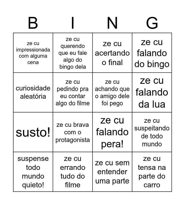 This bingo card has 16 words: ze cu errando tudo do filme, ze cu suspeitando de todo mundo, ze cu acertando o final, ze cu impressionada com alguma cena, susto!, ze cu querendo que eu fale algo do bingo dela, ze cu falando pera!, ze cu sem entender uma parte, curiosidade aleatória, ze cu pedindo pra eu contar algo do filme, suspense todo mundo quieto!, ze cu falando do bingo, ze cu brava com o protagonista, ze cu falando da lua, ze cu achando que o amigo dele foi pego and ze cu tensa na parte do carro.