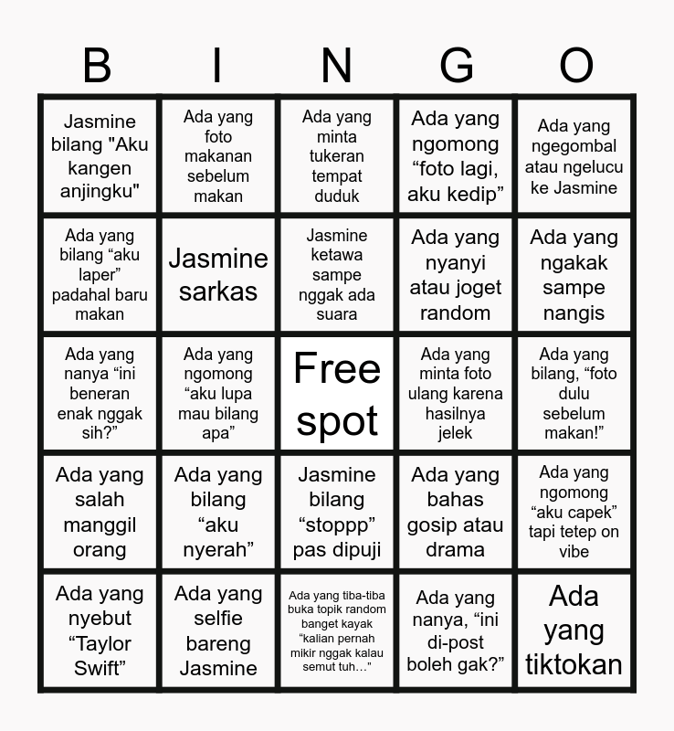 This bingo card has a free space and 24 words: Ada yang bilang “aku nyerah”, Ada yang selfie bareng Jasmine, Jasmine ketawa sampe nggak ada suara, Ada yang nyebut “Taylor Swift”, Ada yang ngegombal atau ngelucu ke Jasmine, Jasmine bilang "Aku kangen anjingku", Ada yang bilang “aku laper” padahal baru makan, Ada yang foto makanan sebelum makan, Ada yang minta foto ulang karena hasilnya jelek, Jasmine bilang “stoppp” pas dipuji, Ada yang nyanyi atau joget random, Ada yang nanya “ini beneran enak nggak sih?”, Ada yang bahas gosip atau drama, Ada yang ngomong “aku capek” tapi tetep on vibe, Jasmine sarkas, Ada yang nanya, “ini di-post boleh gak?”, Ada yang bilang, “foto dulu sebelum makan!”, Ada yang minta tukeran tempat duduk, Ada yang ngakak sampe nangis, Ada yang ngomong “aku lupa mau bilang apa”, Ada yang tiktokan, Ada yang salah manggil orang, Ada yang ngomong “foto lagi, aku kedip” and Ada yang tiba-tiba buka topik random banget kayak “kalian pernah mikir nggak kalau semut tuh…”.