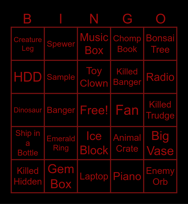 This bingo card has a free space and 107 words: Reginald, Animal, Banger, Bowtie, Chef Frog, Clown, Gnome, Headman, Hidden, Huntsman, Peeper, Mentalist, Reaper, Robe, Rugrat, Shadow Child, Spewer, Trudge, Upscream, Diamond, Emerald Ring, Goblet, Ocarina, Pocket Watch, Uranium Mug, Bonsai Tree, HDD, Chomp Book, Crown, Doll, Frog, Gem Box, Globe, Love Potion, Money, Music Box, Toy Monkey, Uranium Plate, Small Vase, Enemy Orb, Money Bag, 3D Printer, Laptop, Propane Tank, Sample Six Pack, Sample, Bottle, Toy Clown, Computer, Fan, Gramophone, Radio, Ship in a Bottle, Trophy, Medium Vase, Goblin Head, Power Crystal, Hourglass, Barrel, Creature Leg, Flamethrower, Guitar, Sample Cooler, Diamond Display, Saw, Scream Doll, TV, Big Vase, Master Potion, Animal Crate, Ice Block, Dinosaur, Piano, Griffin Statue, Science Station, Harp, Painting, Dumgolf's Staff, Sword, Server Rack, Golden Statue, Grandfather Clock, Broom, DED, NO Damage Taken, Damage Taken, Attacked at Truck, Broke an Item, Killed Reginald, Killed Animal, Killed Banger, Killed Bowtie, Killed Chef Frog, Killed Clown, Killed Gnome, Killed Headman, Killed Hidden, Killed Huntsman, Killed Peeper, Killed Mentalist, Killed Reaper, Killed Robe, Killed Rugrat, Killed Shadow Child, Killed Spewer, Killed Trudge and Killed Upscream.