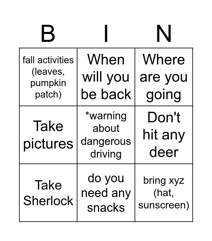 This bingo card has 9 words: Take Sherlock, Where are you going, When will you be back, Take pictures, fall activities (leaves, pumpkin patch), Don't hit any deer, *warning about dangerous driving, bring xyz (hat, sunscreen) and do you need any snacks.