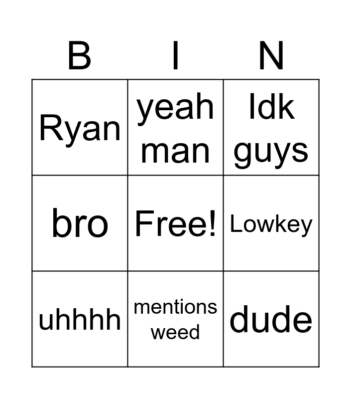 This bingo card has a free space and 8 words: Lowkey, Idk guys, yeah man, uhhhh, Ryan, dude, bro and mentions weed.