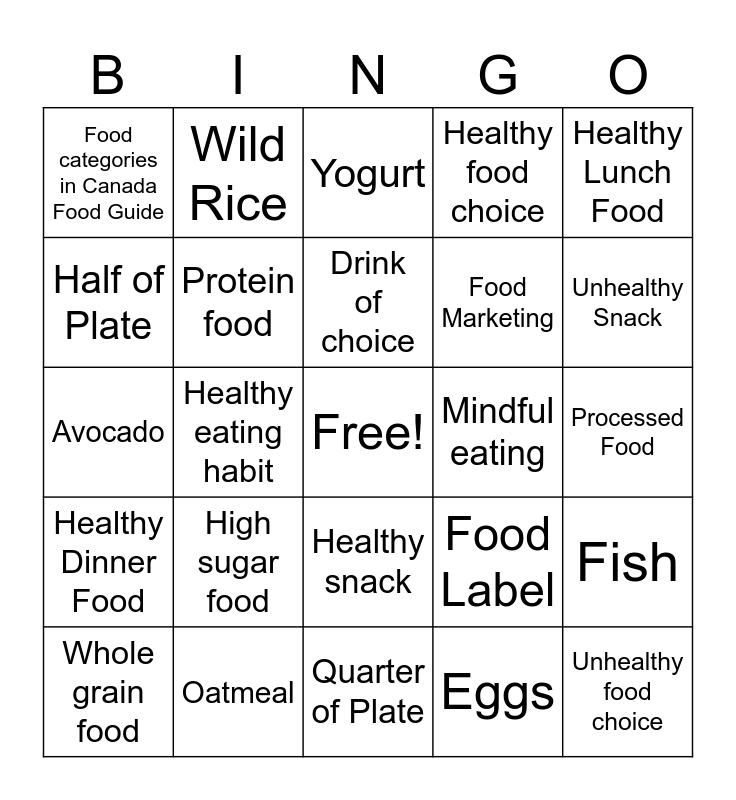 This bingo card has a free space and 39 words: Fruit, High salt food, Vegetable, Protein food, Whole grain food, Healthy snack, Drink of choice, Healthy Breakfast Food, Healthy Lunch Food, Healthy Dinner Food, Healthy eating habit, Healthy food choice, Unhealthy food choice, Processed Food, Mindful eating, High sugar food, Plant based protein, Food categories in Canada Food Guide, Eating a variety of Foods, Food Label, Half of Plate, Quarter of Plate, Food Marketing, Unhealthy Snack, Unhealthy Food Choice, Eating with Others, Benefit of Eating Healthy, Cultural Food, Brown Rice, Wild Rice, Milk, Cheese, Yogurt, Oatmeal, Eggs, Meat, Fish, Avocado and Nuts.