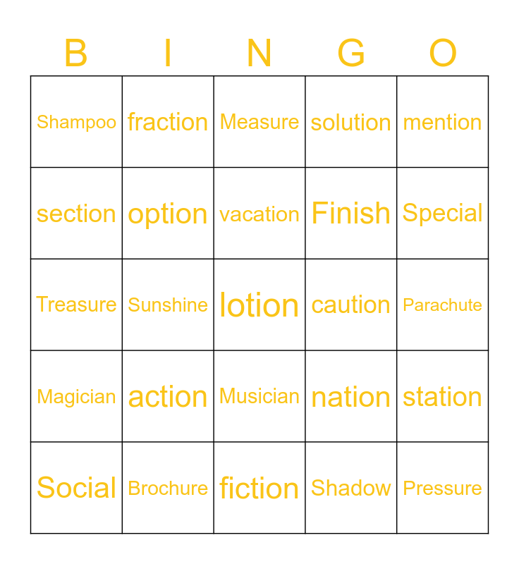 This bingo card has 46 words: function, lotion, pollution, fiction, action, devotion, fraction, mention, section, emotion, option, solution, station, nation, motion, portion, vacation, caution, patient, mention, Sunshine, Shadow, Shampoo, Finish, Friendship, Special, Social, Official, Musician, Magician, Spacious, Gracious, Delicious, Chef, Machine, Brochure, Parachute, Sure, Sugar, Tissue, Pressure, Measure, Treasure, Mission, Expression and Compassion.