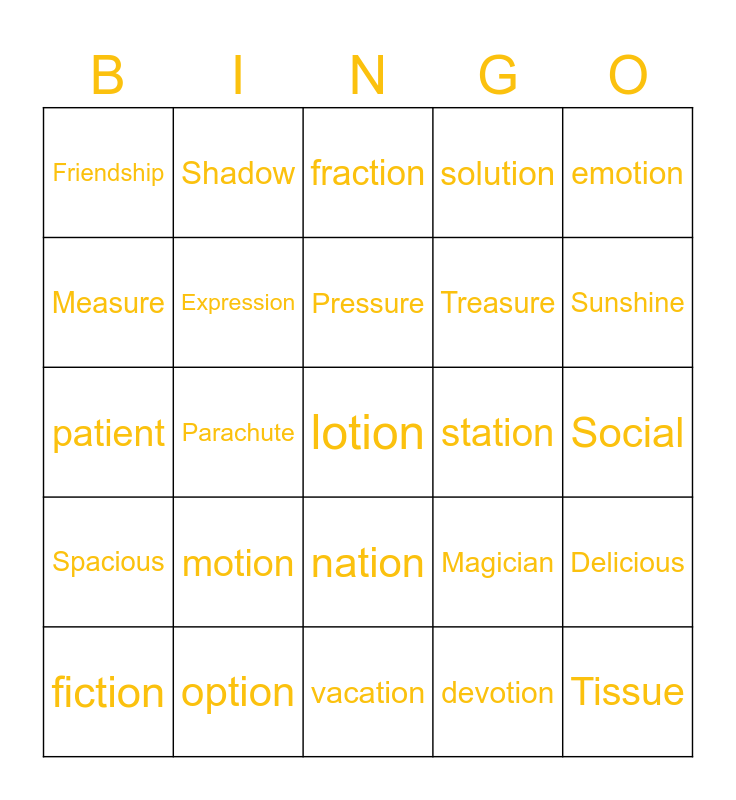 This bingo card has 45 words: function, lotion, pollution, fiction, action, devotion, fraction, section, emotion, option, solution, station, nation, motion, portion, vacation, caution, patient, mention, Sunshine, Shadow, Shampoo, Finish, Friendship, Special, Social, Official, Musician, Magician, Spacious, Gracious, Delicious, Chef, Machine, Brochure, Parachute, Sure, Sugar, Tissue, Pressure, Measure, Treasure, Mission, Expression and Compassion.