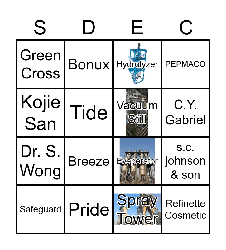 This bingo card has 8 images and 32 words: Dove, Ariel, Spray Tower, Procter & Gamble (P&G), Safeguard, Tide, Hydrolyzer, Unilever, Kojie San, Downy, Vacuum Still, PEPMACO, Belo, Champion, Flash Tank, Wellmade, Bioderm, Breeze, Ion Exchanger, Refinette Cosmetic, Silka, Surf, Storage Silo, Colgate-Palmolive Philippines, Dr. S. Wong, Bonux, Evaporator, C.Y. Gabriel, Green Cross, Pride, Weighing Hopper and s.c. johnson & son.