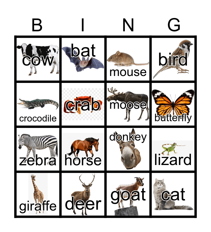 This bingo card has 58 images and 58 words: bear, lion, hedgehog, cat, boar, fox, moose, squirrel, zebra, wolf, bird, dog, rabbit, hippopotamus, tiger, cow, giraffe, crocodile, fish, butterfly, deer, mouse, owl, sheep, chicken, goat, duck, pig, horse, turkey, rhino, elephant, monkey, dolphin, shark, snake, spider, lizard, donkey, koala, parrot, hamster, hen, gorilla, goose, cheetah, sloth, octopus, frog, panda, camel, kangaroo, flamingo, whale, bat, panther, crab and penguin.