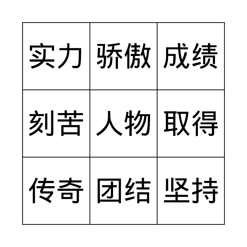 This bingo card has a free space and 8 words: 取得, 成绩, 骄傲, 传奇, 实力, 坚持, 刻苦 and 团结.