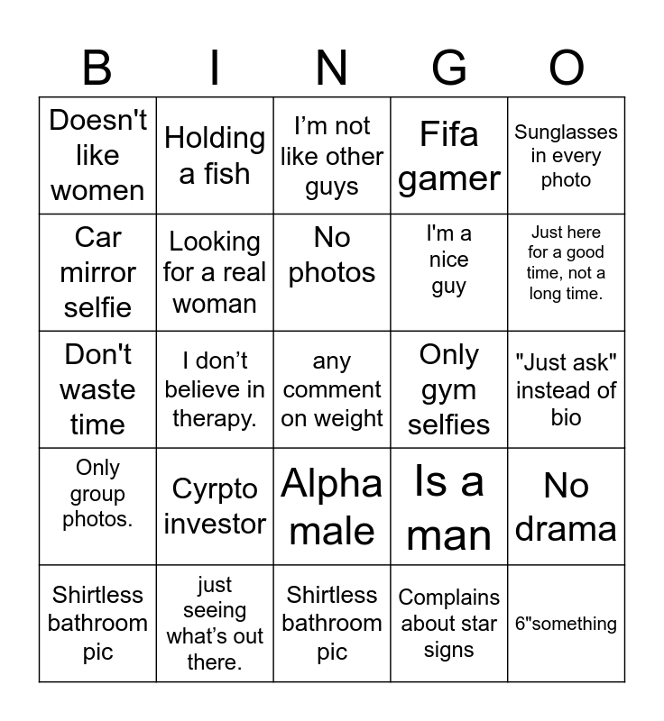 This bingo card has 25 words: Cyrpto investor, Shirtless bathroom pic, No photos, Shirtless bathroom pic, Sunglasses in every photo, Doesn't like women, Car mirror selfie, Holding a fish, Only gym selfies, Alpha male, I'm a nice guy, Don't waste time, Is a man, No drama, Looking for a real woman, 6"something, "Just ask" instead of bio, I’m not like other guys, Just here for a good time, not a long time., I don’t believe in therapy., any comment on weight, just seeing what’s out there., Only group photos., Fifa gamer and Complains about star signs.