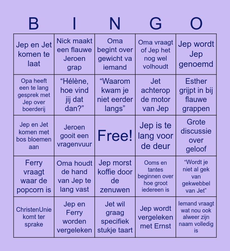 This bingo card has a free space and 24 words: Oma houdt de hand van Jep te lang vast, Jep en Ferry worden vergeleken, “Waarom kwam je niet eerder langs”, ChristenUnie komt ter sprake, Jep wordt Jep genoemd, Jep en Jet komen te laat, Opa heeft een te lang gesprek met Jep over boerderij, Nick maakt een flauwe Jeroen grap, Jep is te lang voor de deur, Jep morst koffie door de zenuwen, Jet achterop de motor van Jep, Jep en Jet komen met bos bloemen aan, Ooms en tantes beginnen over hoe groot iedereen is, “Wordt je niet al gek van gekwebbel van Jet”, “Hélène, hoe vind jij dat dan?”, Jep wordt vergeleken met Ernst, Grote discussie over geloof, Oma begint over gewicht va iemand, Esther grijpt in bij flauwe grappen, Jeroen gooit een vragenvuur, Iemand vraagt wat nou ook alweer zijn naam volledig is, Ferry vraagt waar de popcorn is, Oma vraagt of Jep het nog wel volhoudt and Jet wil graag specifiek stukje taart.