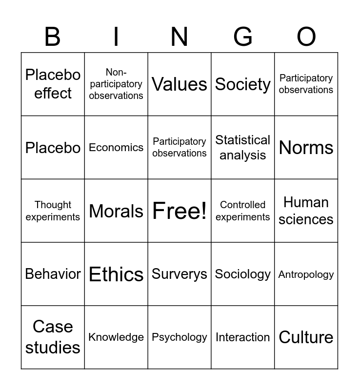 This bingo card has a free space and 25 words: Ethics, Psychology, Participatory observations, Case studies, Participatory observations, Placebo effect, Placebo, Non-participatory observations, Controlled experiments, Surverys, Statistical analysis, Thought experiments, Sociology, Antropology, Economics, Political science, Human sciences, Values, Norms, Morals, Culture, Knowledge, Behavior, Society and Interaction.