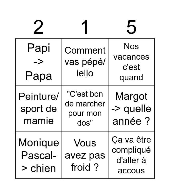 This bingo card has a free space and 8 words: Margot -> quelle année ?, Nos vacances c'est quand, Comment vas pépé/ iello, Monique Pascal-> chien, Papi -> Papa, Ça va être compliqué d'aller à accous, Peinture/ sport de mamie and Vous avez pas froid ?.