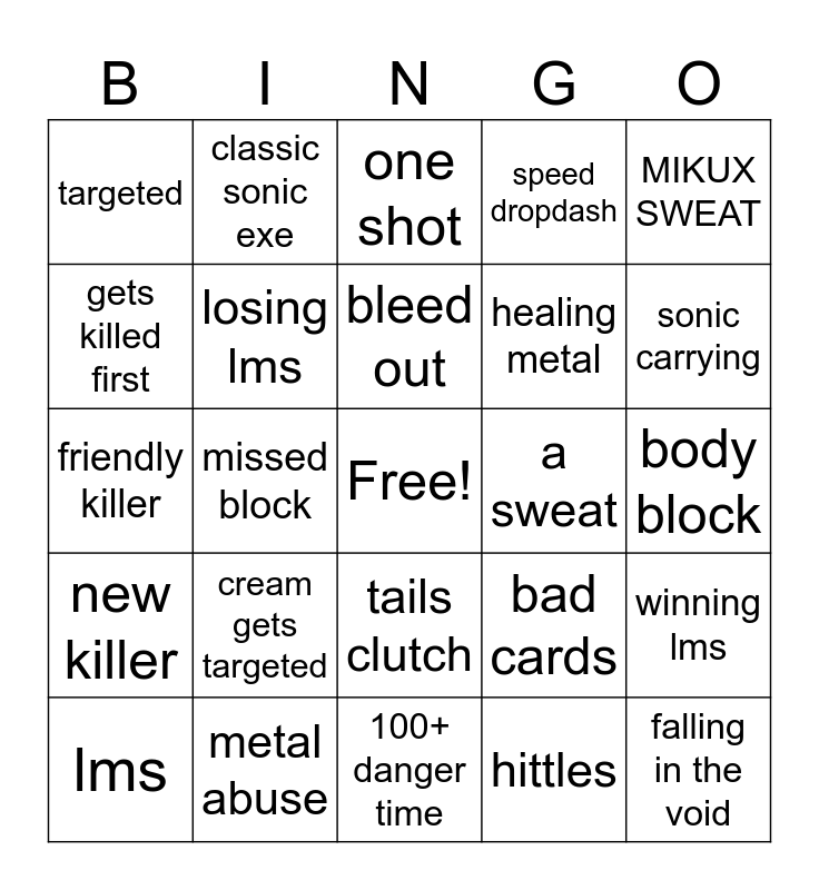 This bingo card has a free space and 24 words: cream gets targeted, metal abuse, bleed out, lms, MIKUX SWEAT, targeted, gets killed first, classic sonic exe, a sweat, tails clutch, healing metal, friendly killer, bad cards, winning lms, losing lms, hittles, body block, one shot, sonic carrying, missed block, falling in the void, new killer, speed dropdash and 100+ danger time.