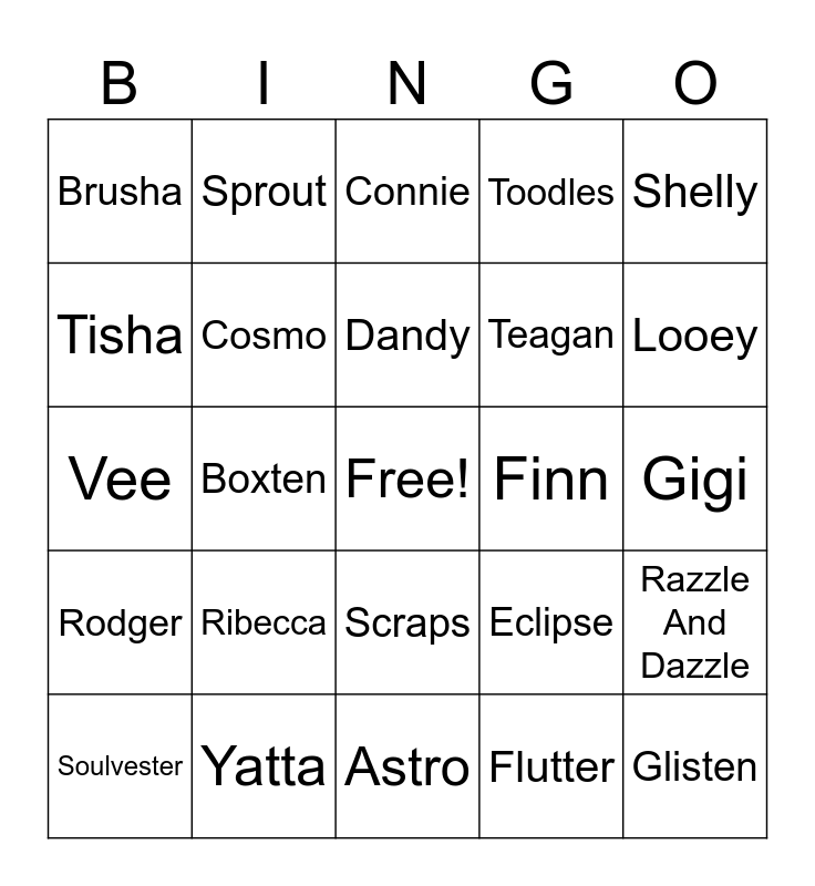 This bingo card has a free space and 31 words: Astro, Blot, Boxten, Brightney, Brusha, Connie, Cosmo, Eclipse, Finn, Flutter, Gigi, Glisten, Goob, Gourdy, Looey, Poppy, Razzle And Dazzle, Ribecca, Rodger, Scraps, Shelly, Shrimpo, Soulvester, Sprout, Teagan, Tisha, Toodles, Vee, Yatta, Dandy and Dyle.