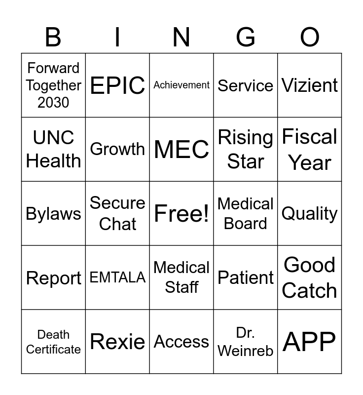 This bingo card has a free space and 24 words: EMTALA, Rexie, MEC, Death Certificate, Vizient, Forward Together 2030, UNC Health, EPIC, Medical Board, Medical Staff, Rising Star, Bylaws, Patient, Good Catch, Growth, Dr. Weinreb, Quality, Achievement, Fiscal Year, Secure Chat, APP, Report, Service and Access.