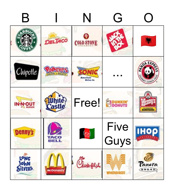 This bingo card has 22 images, a free space and 5 words: Five Guys, ..., 🇦🇫, 🇦🇱 and 🇦🇴.