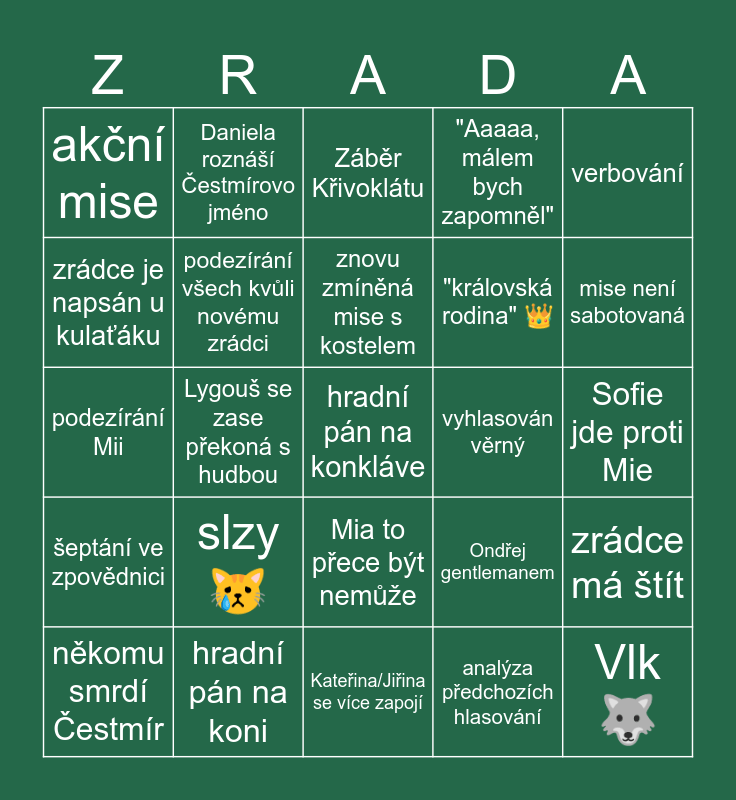 This bingo card has a free space and 24 words: slzy 😿, hradní pán na koni, znovu zmíněná mise s kostelem, někomu smrdí Čestmír, verbování, akční mise, zrádce je napsán u kulaťáku, Daniela roznáší Čestmírovo jméno, vyhlasován věrný, Mia to přece být nemůže, "královská rodina" 👑, podezírání Mii, Ondřej gentlemanem, zrádce má štít, podezírání všech kvůli novému zrádci, analýza předchozích hlasování, Sofie jde proti Mie, Záběr Křivoklátu, mise není sabotovaná, Lygouš se zase překoná s hudbou, Vlk 🐺, šeptání ve zpovědnici, "Aaaaa, málem bych zapomněl" and Kateřina/Jiřina se více zapojí.