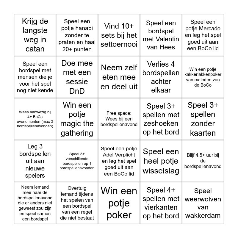 This bingo card has a free space and 31 words: Win een potje poker, Ga all in bij poker, Win een potje magic the gathering, Voltooi een ronde magic maze zonder ook maar ergens te praten, Krijg de langste weg in catan, Vind 10+ sets bij het settoernooi, Doe mee met een sessie DnD, Speel een heel potje wisselslag, Speel 3+ spellen met zeshoeken op het bord, Speel 4+ spellen met vierkanten op het bord, Speel 3+ spellen zonder kaarten, Speel weerwolven van wakkerdam, Raad 5 onderwerpen op een kaart in concepts zonder het hoofdonderwerp te gebruiken, Speel de ‘BoCo Bordspellenavond’ kaart in een potje magic, Win een potje kakkerlakkenpoker van ex-leden van de BoCo, Neem je eigen bordspel mee en speel het, Blijf 4,5+ uur bij de bordspellenavond, Speel 8+ verschillende bordspellen op 1 bordspellenavonden, Leg 3 bordspellen uit aan nieuwe spelers, Speel een potje Adel Verplicht en leg het spel goed uit aan een BoCo lid, Speel een potje Mercado en leg het spel goed uit aan een BoCo lid, Speel een potje 1655 en leg het spel goed uit aan een BoCo lid, Neem iemand mee naar de bordspellenavond die er anders niet geweest zou zijn en speel samen een bordspel, Speel een potje hanabi zonder te praten en haal 20+ punten, Verlies 4 bordspellen achter elkaar, Speel een bordspel met mensen die je voor het spel nog niet kende, Speel een bordspel met Valentin van Hees, Wees aanwezig bij 4+ BoCo evenementen (max 3 bordspellenavonden), Overtuig iemand tijdens het spelen van een bordspel van een regel die niet bestaat, Neem zelf eten mee en deel uit and Neem de jubileumtaler over in Boonanza (hak ik heb je!).