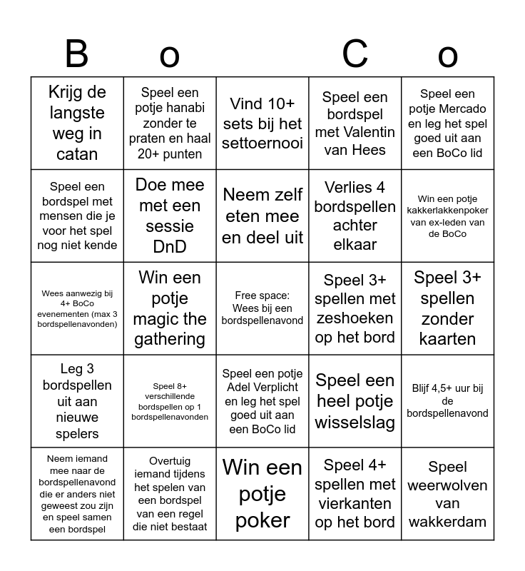 This bingo card has a free space and 31 words: Win een potje poker, Ga all in bij poker, Win een potje magic the gathering, Voltooi een ronde magic maze zonder ook maar ergens te praten, Krijg de langste weg in catan, Vind 10+ sets bij het settoernooi, Doe mee met een sessie DnD, Speel een heel potje wisselslag, Speel 3+ spellen met zeshoeken op het bord, Speel 4+ spellen met vierkanten op het bord, Speel 3+ spellen zonder kaarten, Speel weerwolven van wakkerdam, Raad 5 onderwerpen op een kaart in concepts zonder het hoofdonderwerp te gebruiken, Speel de ‘BoCo Bordspellenavond’ kaart in een potje magic, Win een potje kakkerlakkenpoker van ex-leden van de BoCo, Neem je eigen bordspel mee en speel het, Blijf 4,5+ uur bij de bordspellenavond, Speel 8+ verschillende bordspellen op 1 bordspellenavonden, Leg 3 bordspellen uit aan nieuwe spelers, Speel een potje Adel Verplicht en leg het spel goed uit aan een BoCo lid, Speel een potje Mercado en leg het spel goed uit aan een BoCo lid, Speel een potje 1655 en leg het spel goed uit aan een BoCo lid, Neem iemand mee naar de bordspellenavond die er anders niet geweest zou zijn en speel samen een bordspel, Speel een potje hanabi zonder te praten en haal 20+ punten, Verlies 4 bordspellen achter elkaar, Speel een bordspel met mensen die je voor het spel nog niet kende, Speel een bordspel met Valentin van Hees, Wees aanwezig bij 4+ BoCo evenementen (max 3 bordspellenavonden), Overtuig iemand tijdens het spelen van een bordspel van een regel die niet bestaat, Neem zelf eten mee en deel uit and Neem de jubileumtaler over in Boonanza (hak ik heb je!).
