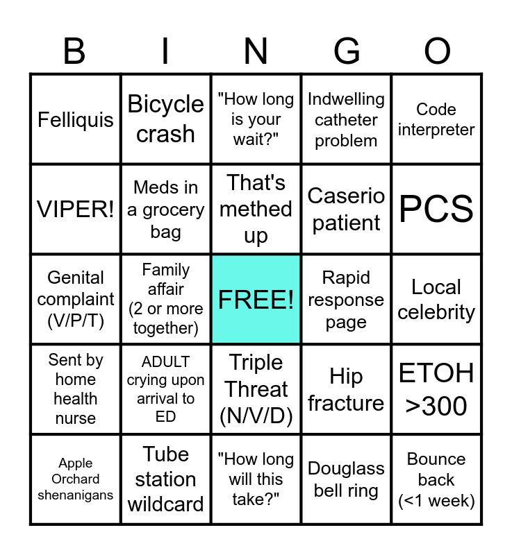 This bingo card has a free space and 24 words: Apple Orchard shenanigans, ADULT crying upon arrival to ED, That's methed up, Douglass bell ring, Code interpreter, Felliquis, Bicycle crash, "How long is your wait?", Rapid response page, Local celebrity, Genital complaint (V/P/T), Meds in a grocery bag, Hip fracture, ETOH >300, VIPER!, Tube station wildcard, "How long will this take?", Indwelling catheter problem, PCS, Sent by home health nurse, Family affair (2 or more together), Triple Threat (N/V/D), Caserio patient and Bounce back (<1 week).
