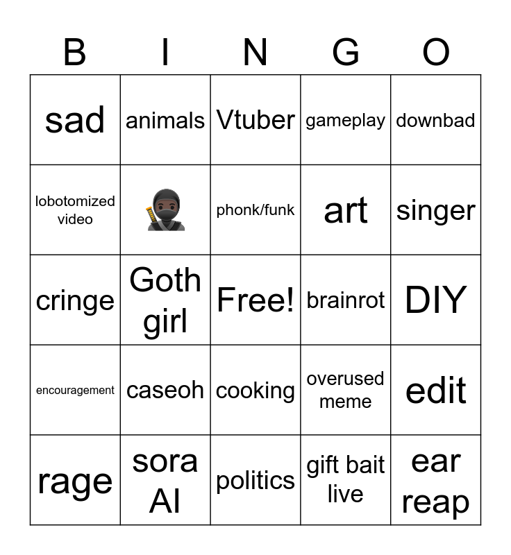 This bingo card has a free space and 24 words: caseoh, sora AI, phonk/funk, rage, downbad, sad, lobotomized video, animals, brainrot, cooking, art, cringe, overused meme, edit, 🥷🏿, gift bait live, DIY, Vtuber, singer, Goth girl, ear reap, encouragement, gameplay and politics.
