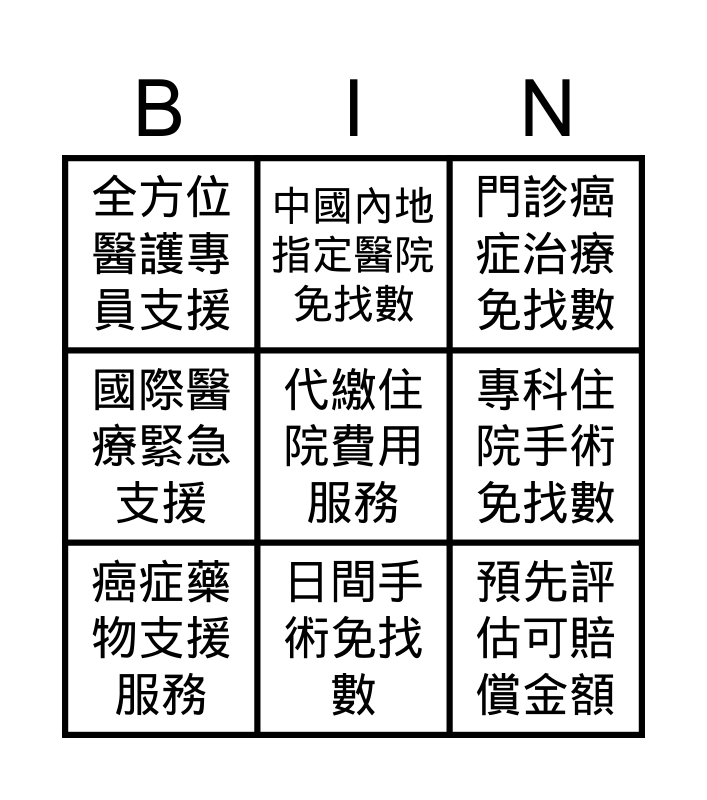 This bingo card has a free space and 8 words: 專科住院手術免找數, 門診癌症治療免找數, 中國內地指定醫院免找數, 癌症藥物支援服務, 全方位醫護專員支援, 預先評估可賠償金額, 國際醫療緊急支援 and 日間手術免找數.