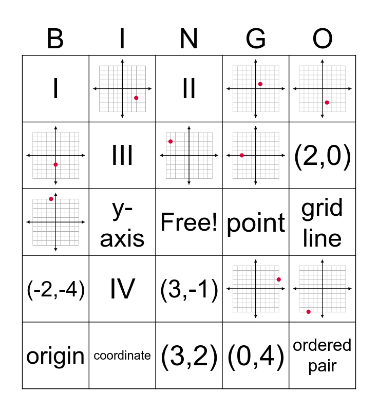 This bingo card has 11 images, a free space and 18 words: origin, x-axis, y-axis, quadrant, I, II, III, IV, point, coordinate, grid line, ordered pair, (3,2), (0,4), (2,0), (-1,4), (3,-1) and (-2,-4).