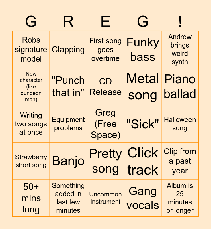 This bingo card has a free space and 24 words: Banjo, Something added in last few minutes, CD Release, 50+ mins long, Andrew brings weird synth, Robs signature model, New character (like dungeon man), Clapping, "Sick", Pretty song, Metal song, Writing two songs at once, Click track, Clip from a past year, "Punch that in", Gang vocals, Halloween song, First song goes overtime, Piano ballad, Equipment problems, Album is 25 minutes or longer, Strawberry short song, Funky bass and Uncommon instrument.
