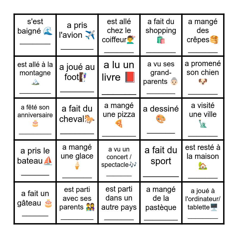 This bingo card has 25 words: a mangé une glace🍦 _______, est parti dans un autre pays _______, a lu un livre 📕______, a fait un gâteau 🎂______, a mangé des crêpes🥞 _______, s'est baigné 🌊_______, est allé à la montagne🏔️ ________, a pris l'avion ✈️ _______, a dessiné🎨 ______, a vu un concert / spectacle🎶 _______, a vu ses grand-parents 👵🏻 _______, a fêté son anniversaire 🎂_________, a fait du sport _______, est resté à la maison 🏡 _______, a joué au foot🧗🏻♀️ _______, a joué à l'ordinateur/ tablette🖥️ ________, a visité une ville🗽 _______, est allé chez le coiffeur💇♂️ _______, a promené son chien🐶 _______, a fait du cheval🐎 _______, a mangé une pizza 🍕________, est parti avec ses parents 👨👩👦👦________, a pris le bateau⛵ ______, a fait du shopping🛍️ _______ and a mangé de la pastèque ________.