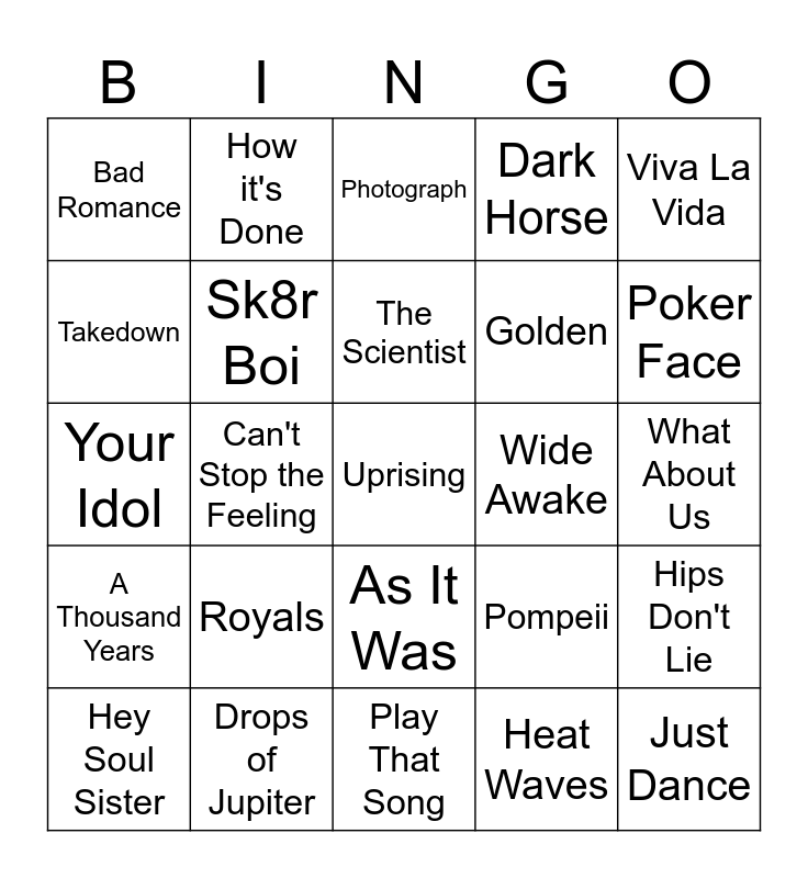 This bingo card has 36 words: Rolling In The Deep, Someone Like You, Send My Love (To Your New Lover), Sk8r Boi, Pompeii, A Thousand Years, The Scientist, Clocks, Viva La Vida, What Ever It Takes, Can't Stop the Feeling, Dark Horse, Roar, Wide Awake, Poker Face, Bad Romance, Just Dance, Royals, Uprising, Photograph, What About Us, Hips Don't Lie, Drops of Jupiter, Hey Soul Sister, Play That Song, How it's Done, Your Idol, Soda Pop, Golden, Takedown, Ordinary, Eternity, Heat Waves, As It Was, Watermelon Sugar and Someone That I used to Know.