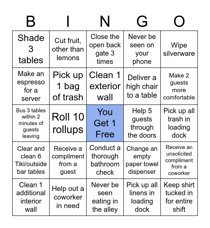 This bingo card has a free space and 24 words: Receive a compliment from a guest, Help out a coworker in need, Clean 1 exterior wall, Clean 1 additional interior wall, Wipe silverware, Shade 3 tables, Make an espresso for a server, Cut fruit, other than lemons, Help 5 guests through the doors, Conduct a thorough bathroom check, Deliver a high chair to a table, Bus 3 tables within 2 minutes of guests leaving, Change an empty paper towel dispenser, Receive an unsolicited compliment from a coworker, Pick up 1 bag of trash, Pick up all linens in loading dock, Pick up all trash in loading dock, Close the open back gate 3 times, Make 2 guests more comfortable, Roll 10 rollups, Keep shirt tucked in for entire shift, Clear and clean 6 Tiki/outside bar tables, Never be seen on your phone and Never be seen eating in the alley.