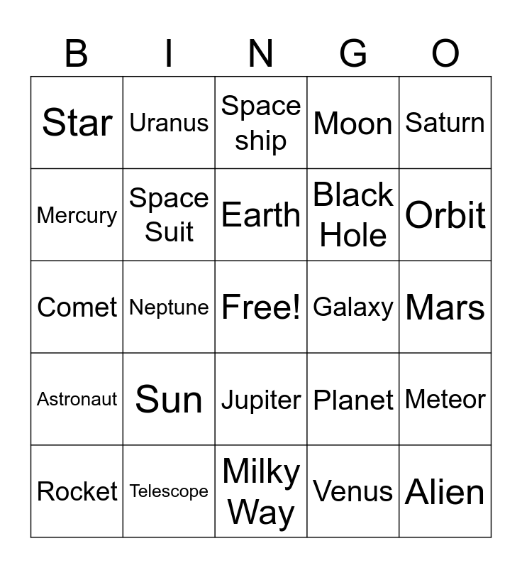 This bingo card has a free space and 24 words: Sun, Telescope, Earth, Rocket, Saturn, Star, Mercury, Uranus, Galaxy, Jupiter, Black Hole, Comet, Planet, Meteor, Space Suit, Venus, Mars, Space ship, Orbit, Neptune, Alien, Astronaut, Moon and Milky Way.