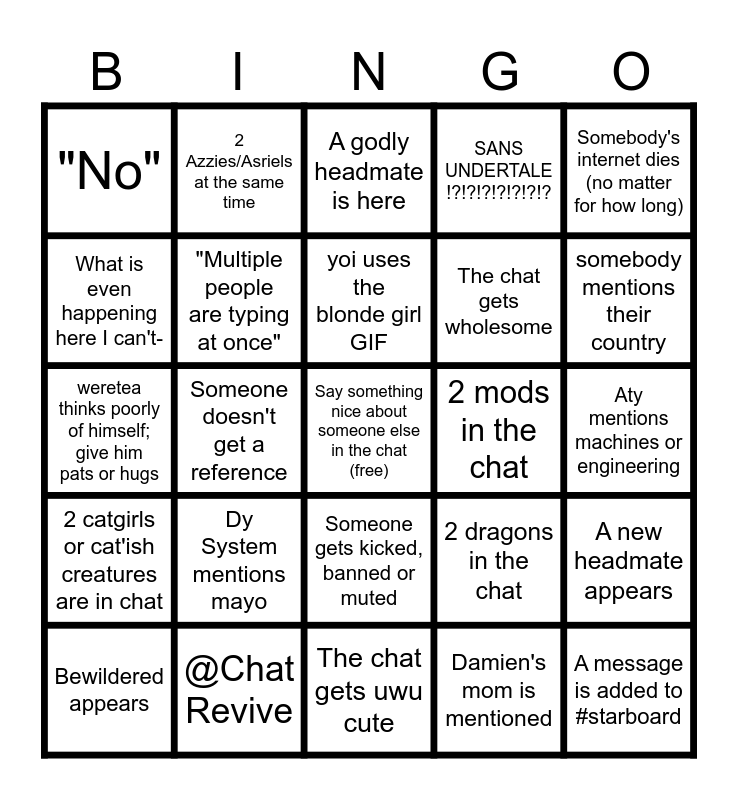 This bingo card has a free space and 24 words: Dy System mentions mayo, @Chat Revive, yoi uses the blonde girl GIF, Bewildered appears, Somebody's internet dies (no matter for how long), "No", What is even happening here I can't-, 2 Azzies/Asriels at the same time, 2 mods in the chat, Someone gets kicked, banned or muted, The chat gets wholesome, weretea thinks poorly of himself; give him pats or hugs, 2 dragons in the chat, A new headmate appears, "Multiple people are typing at once", Damien's mom is mentioned, Aty mentions machines or engineering, A godly headmate is here, somebody mentions their country, Someone doesn't get a reference, A message is added to #starboard, 2 catgirls or cat'ish creatures are in chat, SANS UNDERTALE !?!?!?!?!?!?!? and The chat gets uwu cute.