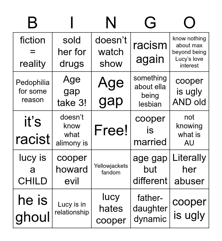 This bingo card has a free space and 24 words: cooper howard evil, Lucy is in relationship, Age gap, he is ghoul, know nothing about max beyond being Lucy’s love interest, fiction = reality, Pedophilia for some reason, sold her for drugs, cooper is married, Yellowjackets fandom, something about ella being lesbian, it’s racist, age gap but different, Literally her abuser, Age gap take 3!, father-daughter dynamic, not knowing what is AU, doesn’t watch show, cooper is ugly AND old, doesn’t know what alimony is, cooper is ugly, lucy is a CHILD, racism again and lucy hates cooper.